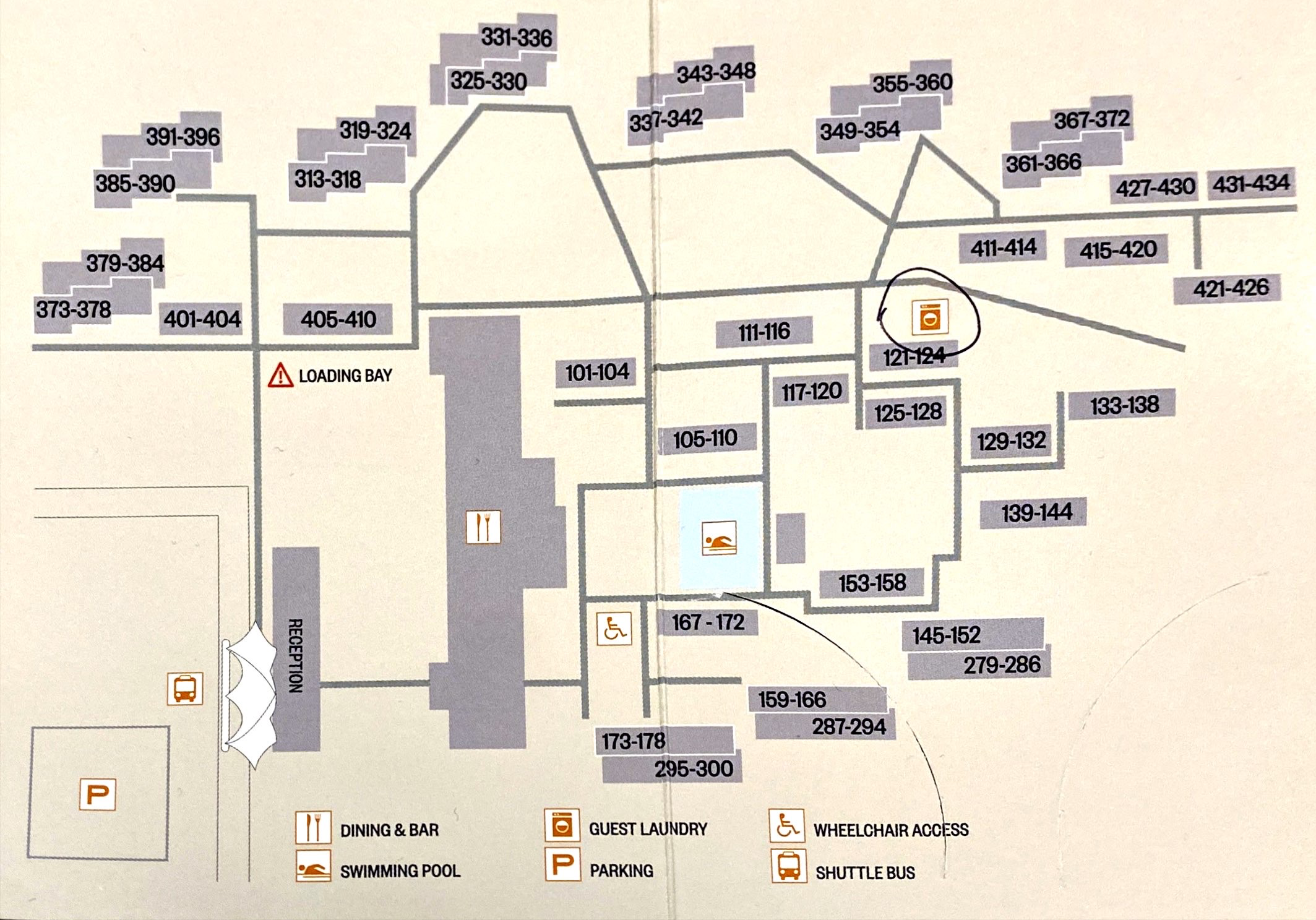 Desert Garden Hotel에서 뭐 별 것없는 시설 중에 그나마 마음에 드는 것이 세탁시설이 무료라는 것이다. 아래와 같은 호텔 내부 지도에서 124호 옆에 세탁실이 마련되어 있다.